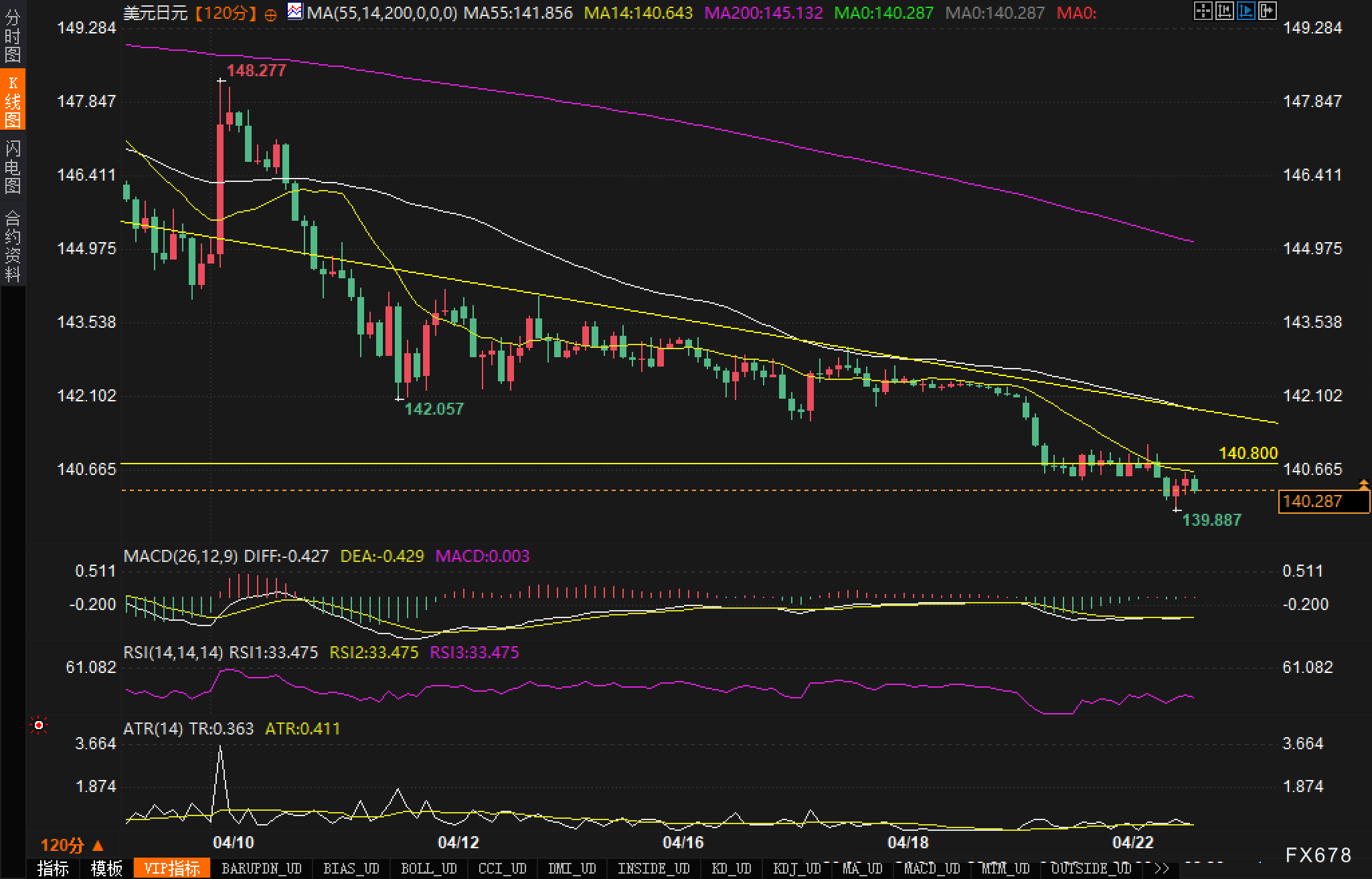 汇通财经APP讯——周二(4月22日),美元/日元展开激烈博弈,汇价延续此前下行趋势,盘中一度触及140.00心理关口下方位置,显现出市场对美元疲软与日元强势的持续关注。受美国与日本可能进行更多关税相关谈判及货币讨论的预期影响,短期看空情绪在市场当中继续发酵,令美元/日元承压下行。