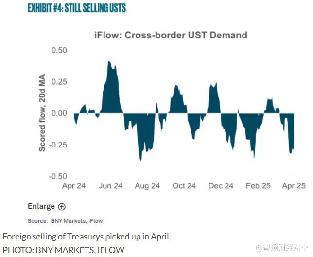 Velis指出,截至4月11日当周,美国国债的跨境资金流动几乎低于正常水平一个标准差,成为近年来最严重的一次抛售潮之一。根据数据,自4月4日以来的11个交易日中,有8天都出现了外国投资者净卖出美国国债的情况。
