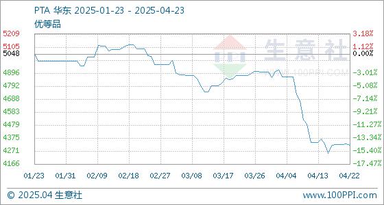 4月23日,生意社PTA基准价为4316.25元/吨,与本月初(4861.60元/吨)相比,下降了-11.22%。