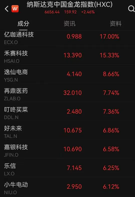 中概股方面,纳斯达克中国金龙指数涨超2%,热门个股中,阿里巴巴、小鹏汽车涨超3%。