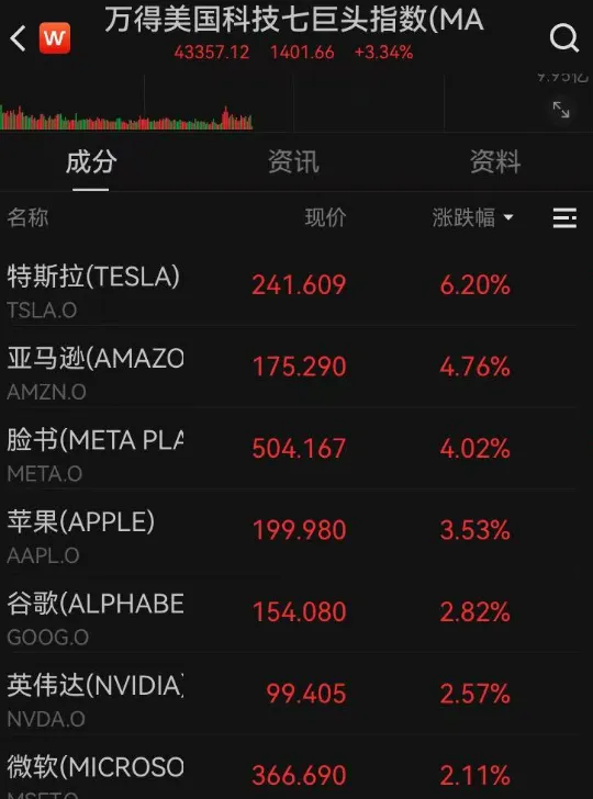 大型科技股集体走高。其中,特斯拉涨超6%,消息面上,特斯拉将于盘后发布2025年第一季度财报。