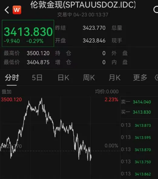 而黄金则在经历大涨后开始跳水,截至发稿,现货黄金翻绿,目前报3413美元,日内振幅近100美元,此前,现货黄金曾涨破3500美元。