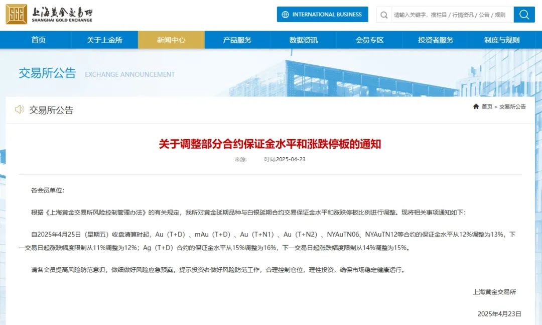 《关于调整部分合约保证金水平和涨跌停板的通知》称,根据《上海黄金交易所风险控制管理办法》的有关规定,对黄金延期品种与白银延期合约交易保证金水平和涨跌停板比例进行调整。自2025年4月25日(星期五)收盘清算时起,Au(T+D)、mAu(T+D)、Au(T+N1)、Au(T+N2)、NYAuTN06、NYAuTN12等合约的保证金水平从12%调整为13%,下一交易日起涨跌幅度限制从11%调整为12%;Ag(T+D)合约的保证金水平从15%调整为16%,下一交易日起涨跌幅度限制从14%调整为15%。