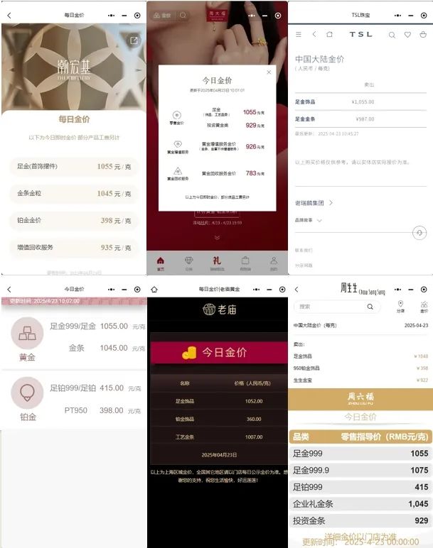 具体而言,4月23日,周大福足金(首饰、摆件类)、六福珠宝足金999/足金、潮宏基足金(首饰摆件)、谢瑞麟足金饰品、周六福足金999境内价格为1055元/克,单克较前一日下跌27元;老庙黄金上海区域足金饰品价格为1052元/克,单克较前一日下跌6元;周生生足金首饰境内价格为1048元/克,单克较前一日下跌4元。