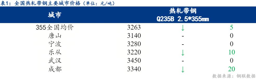 17日热轧带钢全国主要城市价格稳中偏弱,截至发稿时2.5*355mm热轧带钢均价3263元/吨,较昨下跌5元/吨,其中2.5*355mm主要城市报价为唐山3140元/吨,宁波3280元/吨,乐从3220元/吨。