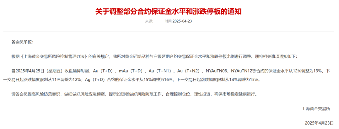 自2025年4月25日(星期五)收盘清算时起,Au(T+D)、mAu(T+D)、Au(T+N1)、Au(T+N2)、NYAuTN06、NYAuTN12等合约的保证金水平从12%调整为13%,下一交易日起涨跌幅度限制从11%调整为12%;Ag(T+D)合约的保证金水平从15%调整为16%,下一交易日起涨跌幅度限制从14%调整为15%。