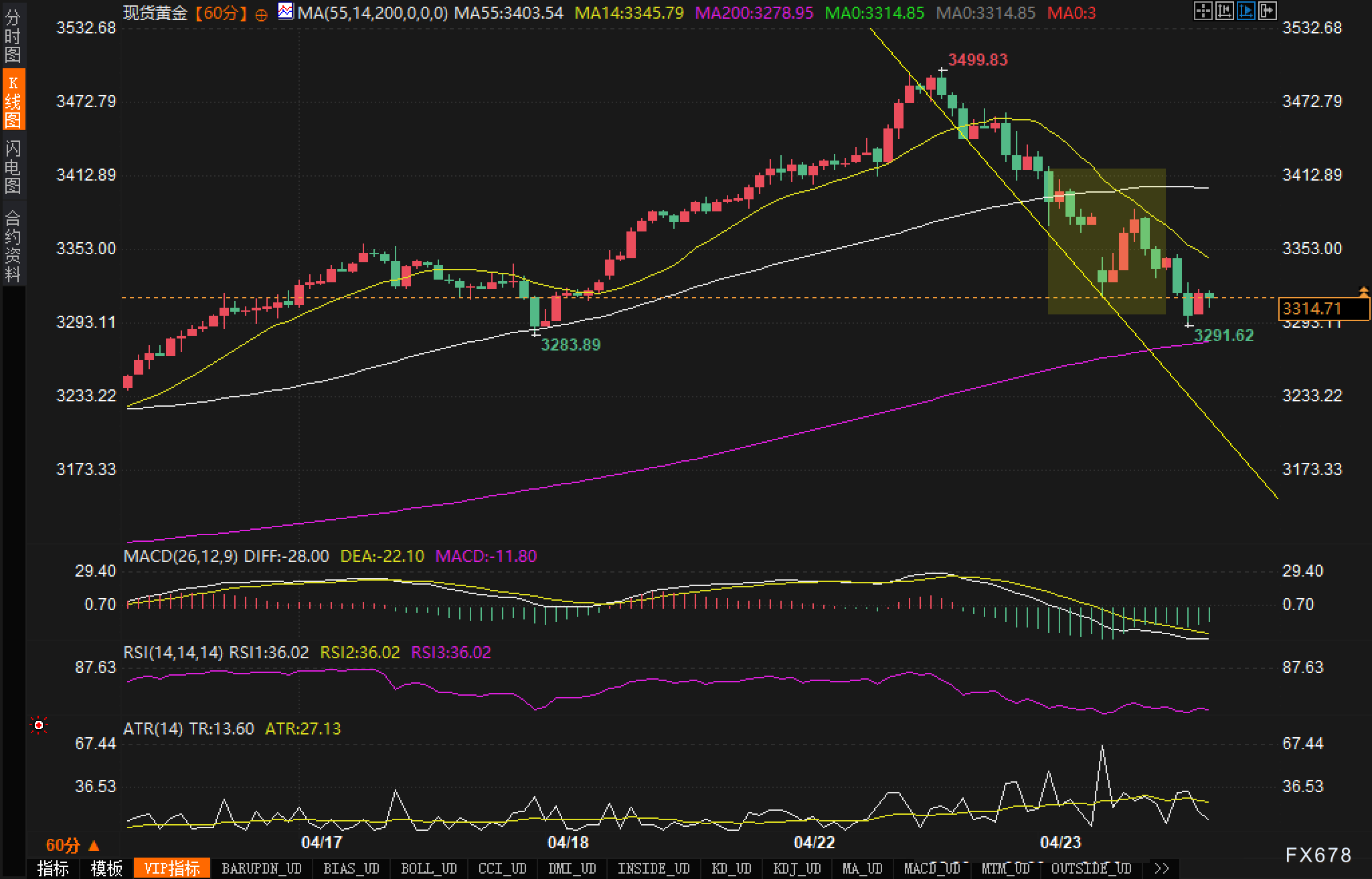 小时图:金价从3499.83美元高位逐步回落,短线呈明显下降趋势线压制,且一度触及3291.62美元附近的支撑区域。MACD指标快慢线下穿零轴,柱状图呈现放量绿柱,暗示短线动能仍偏空。相对强弱指数(RSI)则在低位区域震荡,说明短期内卖压较重但已接近一定超卖水平。平均真实波幅(ATR)有所放大,提示短周期内波动率加剧,需警惕急速反向波动的可能性。