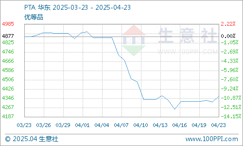 原油市场提振之下,截止4月23日华东地区市场均价在4366元/吨,较上一交易日上涨1.17%。近期PTA负荷变化不大,原计划上周重启的逸盛大化375万吨4月20日重启5成,后期恒力惠州2#250万吨计划4月28日进行检修。