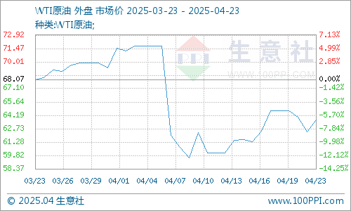 4月22日,国际原油期货上涨。美国WTI原油期货主力合约结算价报63.67美元/桶,涨幅1.26美元或2.0%。布伦特原油期货主力合约结算价报67.44美元/桶,涨幅1.18美元或1.8%。