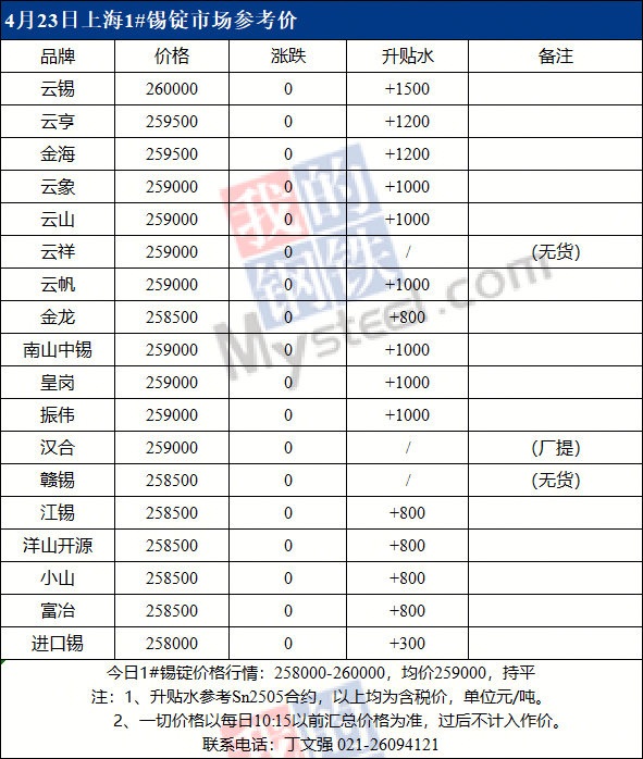 4月23日Mysteel上海现货锡锭报价258000-260000元/吨,均价259000元/吨,较上一交易日持平。Mysteel15:30上海现货锡锭成交价格257500-260500元/吨,均价259000元/吨,较上一交易日涨500元/吨。