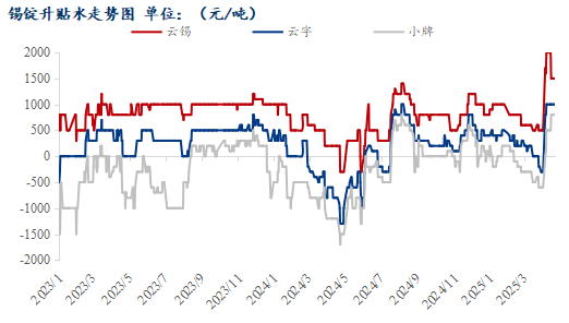 今日套盘商对沪锡2505合约套盘云锡升水1500元/吨左右,普通云字升水1000-1200元/吨左右;小牌升水800元/吨左右,进口锡升水300元/吨左右。
