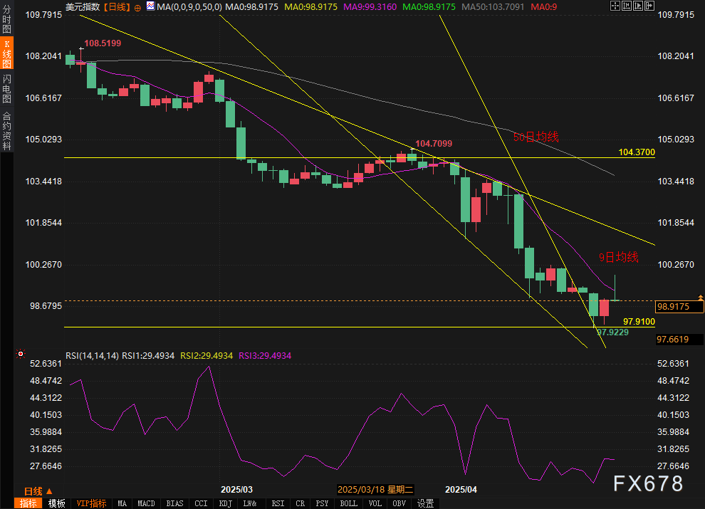 展望未来,美元指数的走势将在基本面与技术面的交织中寻找方向。短期内,特朗普关税言论的缓和以及鲍威尔地位的稳定可能继续为美元提供支撑,尤其是在RSI接近超卖的背景下,技术性反弹的可能性增加。然而,市场对贸易政策可持续性的怀疑,以及美国经济潜在放缓的压力,可能限制反弹空间。技术面上,98.50-99.00区间是短期震荡的可能范围。若能回升至99.63上方,短期多头动能可能增强,测试101.20的下降通道上沿;反之,若跌破97.91,空头趋势可能加速,97.20将成为下一目标。