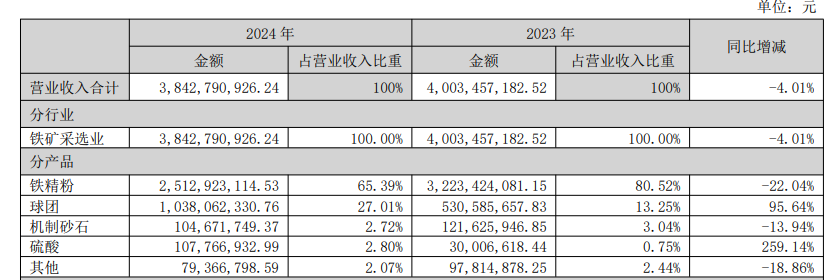 2024年,铁精粉和球团收入占比为92.4%。细分来看,铁精粉实现营收25.13亿元,同比下滑22.04%,营收占比65.39%;球团实现营收10.38亿元,同比大增95.64%,营收占比27.01%。虽然球团增长强劲但营收体量相对较小,难以带动整体营收增长。