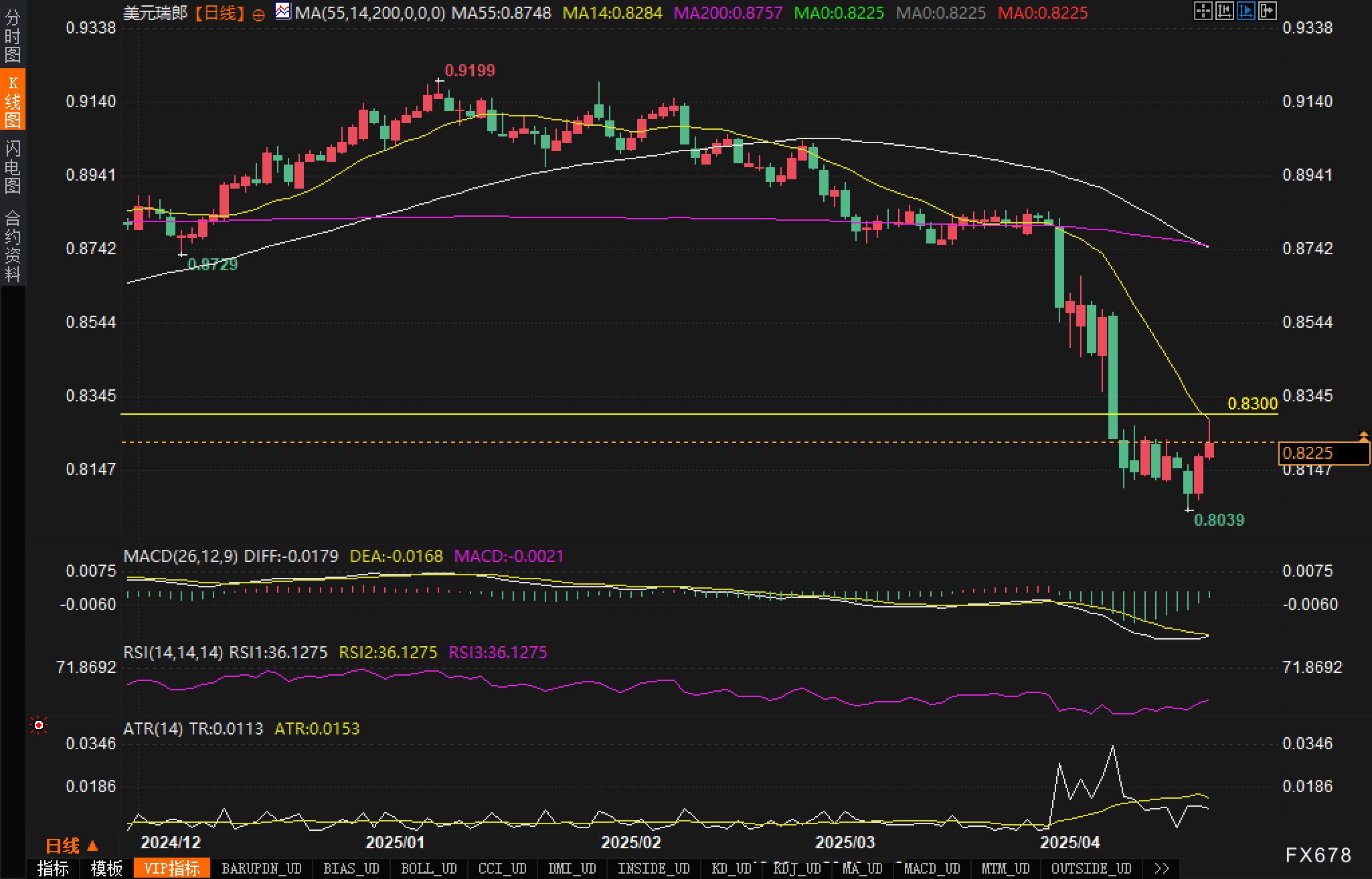 日线图显示,美元/瑞郎汇价近期经历了剧烈下跌,从0.9199高点一路下滑至0.8039低点,跌幅超过12%。目前价格已跌破所有主要移动平均线,处于明显的下行通道中。MACD指标呈现明显的空头排列,DIFF:-0.0179、DEA:-0.0168,MACD值为-0.0021,且处于零轴下方。RSI指标读数为36.1275,但尚未出现明显的底背离信号。从图表形态看,价格在0.8300构成重要阻力位,而0.8039则是近期强支撑位。TR指标读数为0.0113,表明市场波动性维持在较高水平。