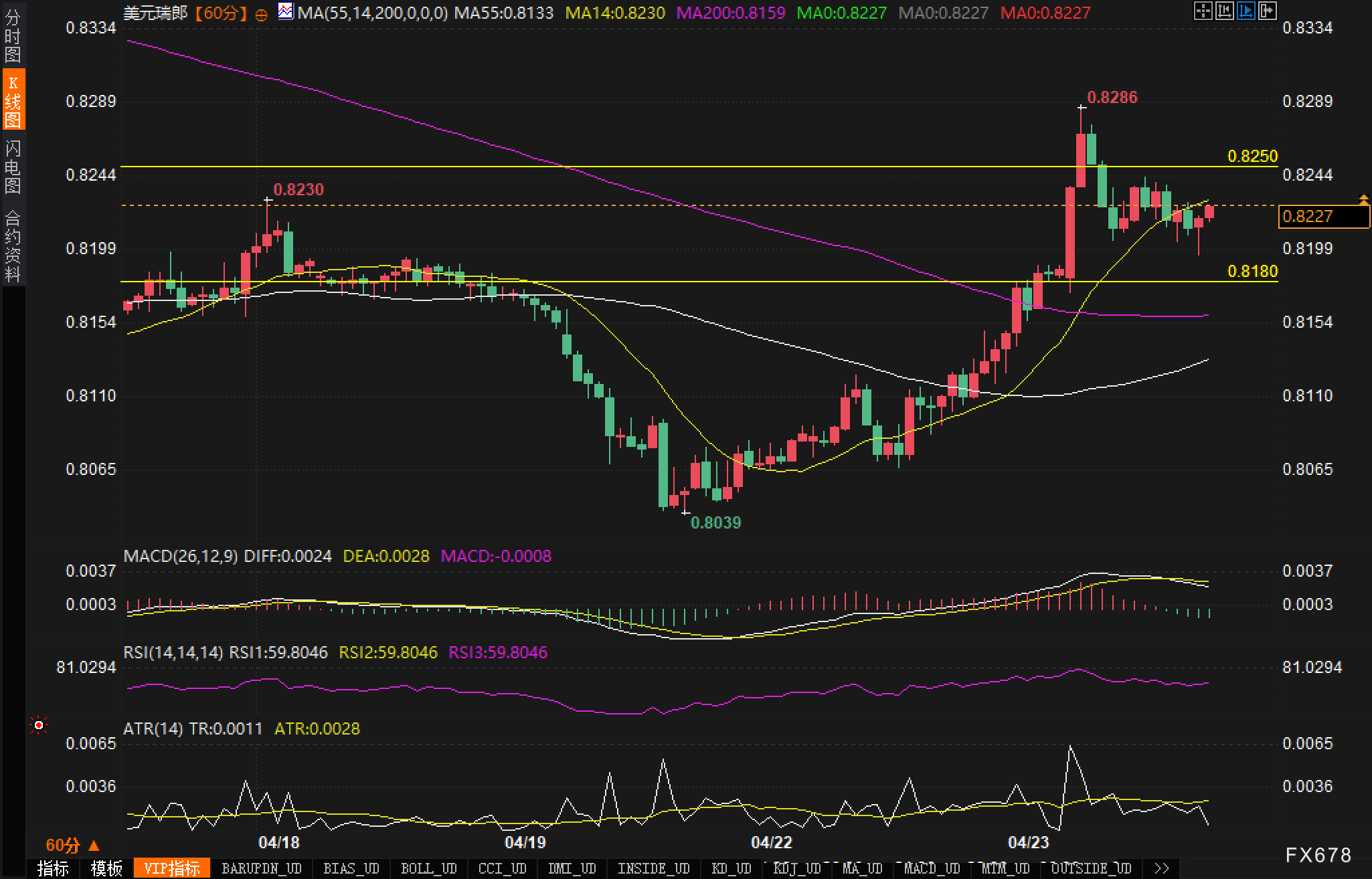 从60分钟图表来看,美元/瑞郎汇价在0.8039低点形成双底形态后展开反弹,目前已上行至0.8230水平。MACD指标显示DIFF:0.0024、DEA:0.0028,虽然MACD值为至0.0008略处于零轴下方,但柱状图正在缩短,暗示空头动能减弱。同时,RSI指标读数为59.8046,接近超买区域但尚未进入,表明上行趋势仍有延续空间。汇价目前在0.8180和0.8250之间形成新的整理区间,交易员关注这一区间的突破方向。