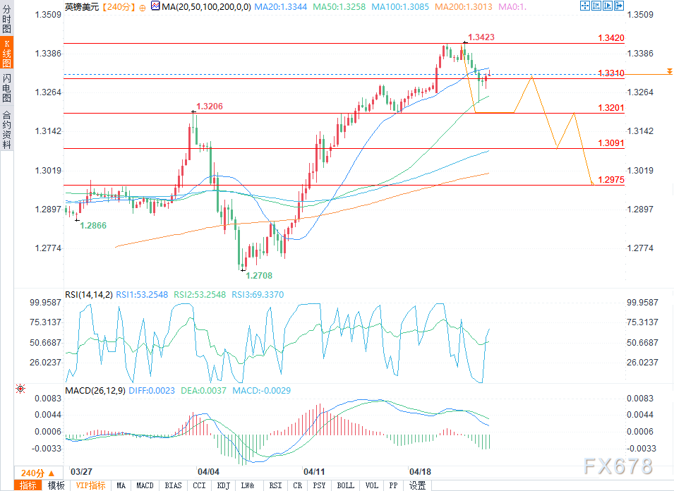 4小时图上,英镑兑美元在1.3066附近形成盘整区间,随后以波浪结构向上突破至1.3420,之后向1.3200回调,目前恢复向上的动力,上行至1.3310附近,有可能在该水平附近建立新的盘整区间。MACD指标支持这一前景,其信号线离开柱状图区域并急剧向下,表明近期有看跌势头。