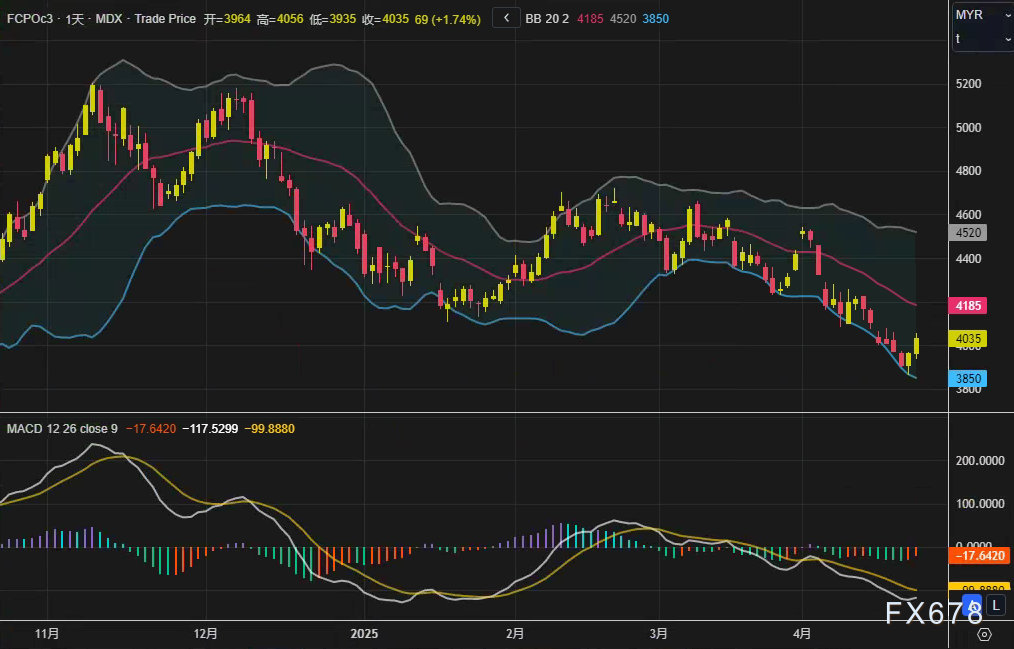 汇通财经APP讯——周三(4月23日),马来西亚棕榈油期货(FCPOc3)呈现显著反弹,7月交割的基准合约在马来西亚衍生品交易所收盘报4035林吉特/吨,上涨69林吉特,涨幅1.74%,日内早盘一度涨超2%。市场情绪在多重因素推动下转为乐观,棕榈油价格受低位买盘和技术性反弹支撑,叠加食用油市场整体走强及原油价格上涨的提振。印度需求回暖、印尼出口数据强劲以及马来西亚林吉特汇率走弱,进一步为价格上行提供动能。然而,技术面显示反弹动能可能受限。以下从基本面、技术面和市场情绪角度,剖析棕榈油的最新变化及未来走势。