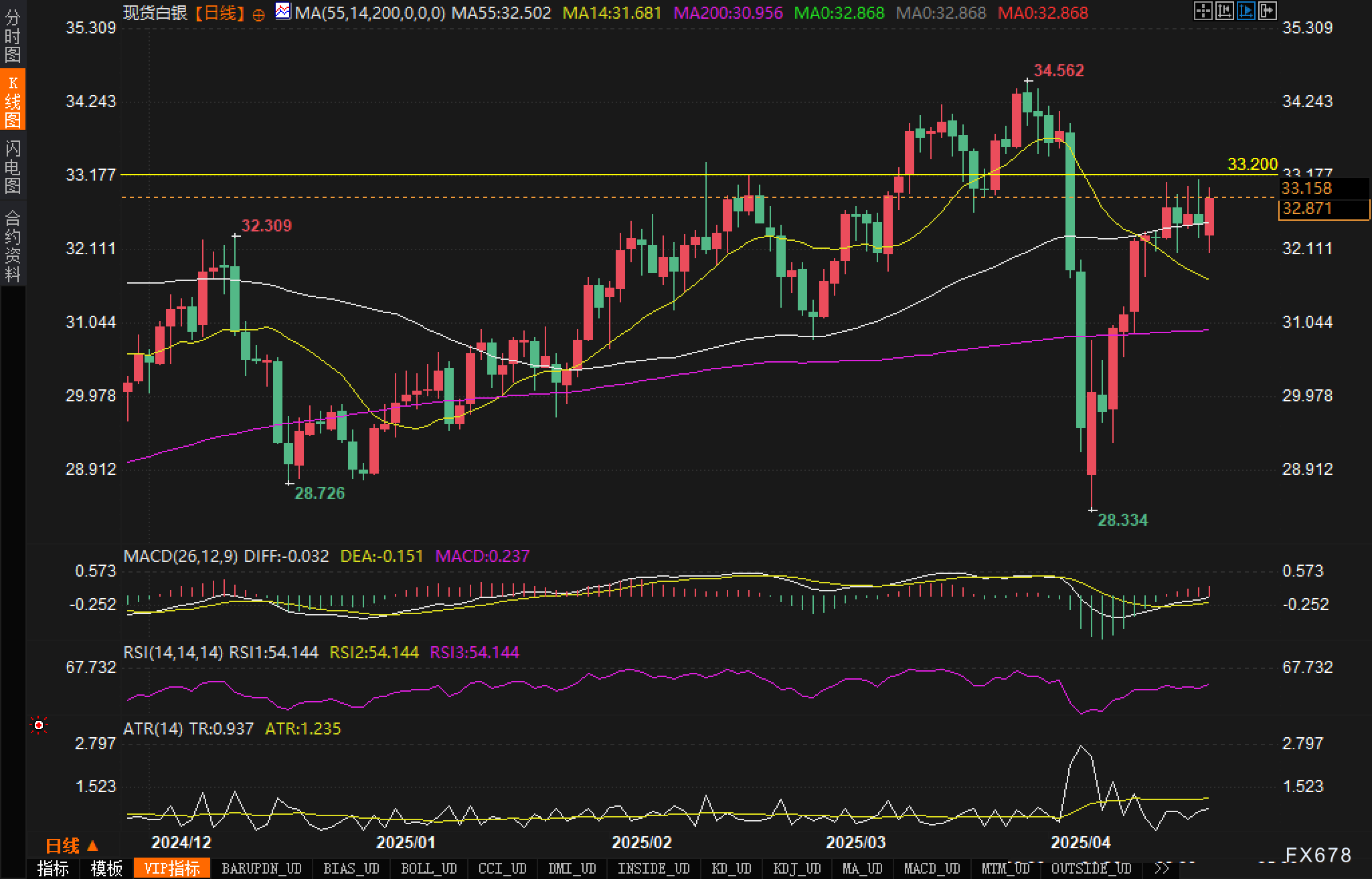 日线图表揭示关键转折信号。当前价格站稳MA55均线(32.502)上方,且MA14(31.681)与MA20(30.956)形成多头排列,中长期趋势线呈现15度角温和上行。MACD柱状图出现底背离特征:价格在4月低点28.726美元时,DIFF值(-0.032)已高于前低,配合DEA线(-0.151)走平,暗示下跌动能衰竭。RSI位于54.144,既未进入超买区又维持看涨态势,这种"金叉未满"状态常出现在趋势初期。值得警惕的是ATR(14)指标显示1.235的平均真实波幅,较三个月均值放大37%,提示未来突破行情可能伴随剧烈波动。上方关键阻力在34.243-34.562美元区间(3月高点与斐波那契61.8%回撤位重合处),下方支撑则需关注31.0美元。