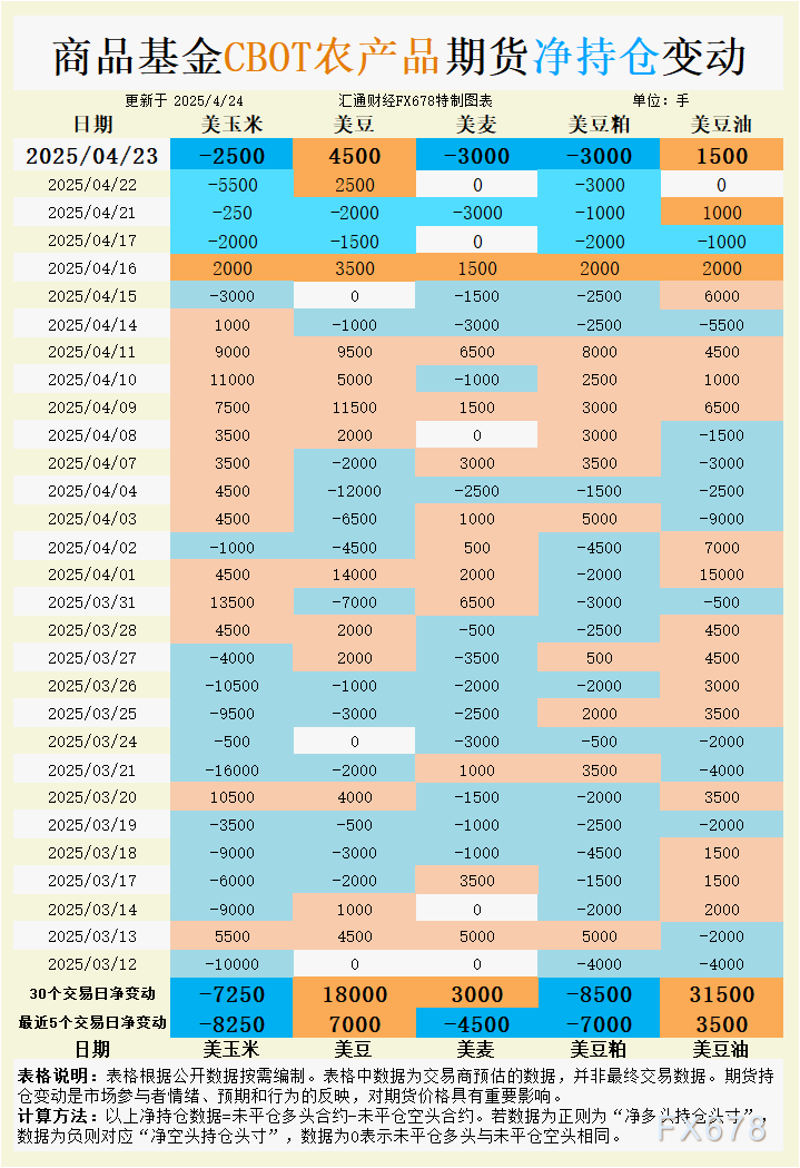 汇通财经APP讯——周四(4月24日),芝加哥期货交易所(CBOT)谷物期货市场呈现分化走势,市场情绪受到美国国内基本面、国际交易动态及持仓变动的影响。北京时间今日,大豆期货因关税言论缓和及技术性买盘支撑升至两月高点,5月合约收于10.50-1/4美元/蒲式耳。玉米和小麦则承压下行,5月玉米合约收跌至4.79-1/4美元/蒲式耳,5月小麦合约收于5.43-1/2美元/蒲式耳。豆粕期货因需求疲软和供应充足而走弱,5月合约收于290.80美元/短吨,豆油则受植物油市场紧张预期支撑,表现相对坚挺。持仓数据显示,4月23日商品基金在玉米和小麦上增加净空头,在大豆和豆油上增持净多头,豆粕则延续净空头趋势,反映市场对各品种前景的分歧。以下结合基本面、持仓变化及基差动态,分析各品种的市场情绪及未来走势。