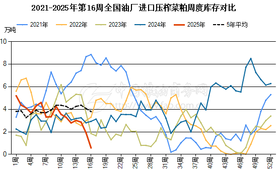 (1)蛋白粕库存下滑较快。粮油商务网数据显示,截止到2025年第16周末,国内豆粕库存量为15.4万吨,较上周的28.8万吨减少13.4万吨,环比下降46.60%。国内进口压榨菜粕库存量为0.6万吨,较上周的1.9万吨减少1.3万吨,环比下降69.63%。