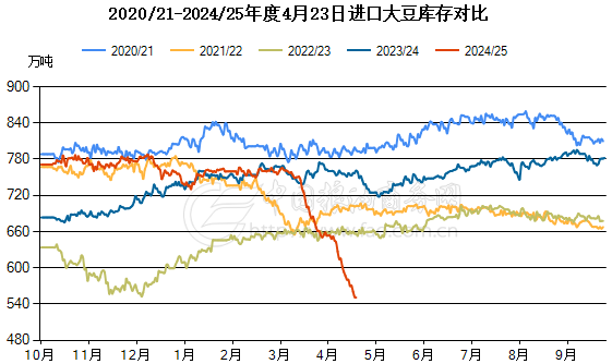 (3)截止到4月22日,主要港口的进口大豆库存量约在550万吨,去年同期库存为760万吨,五年平均690万吨。油厂进口大豆库存近两周有所恢复,但仍处于相对低位。