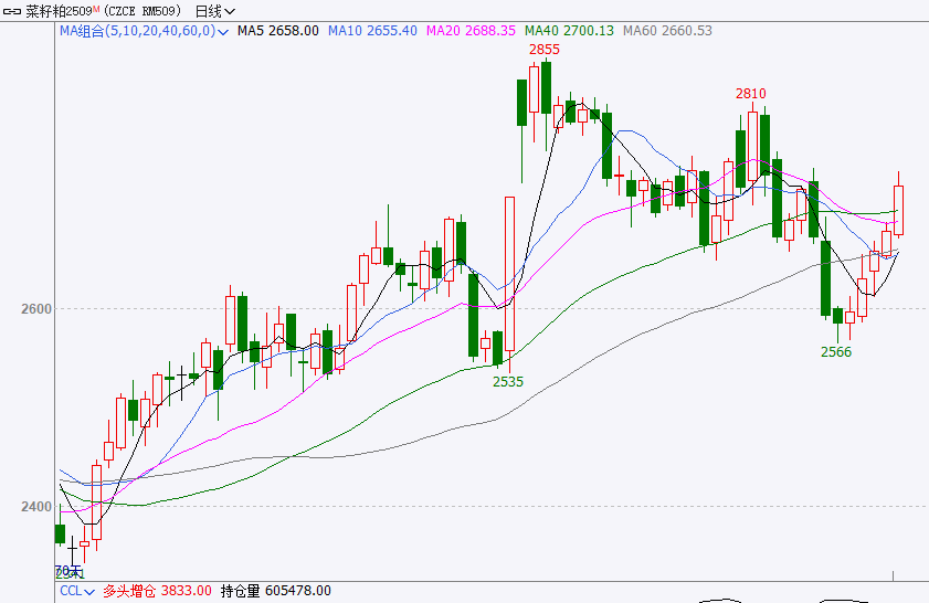 今日郑州菜粕价格出现较大幅上涨,截至今日收盘菜粕主力2509合约报2725元/吨,日上涨56元/吨,涨幅2.1%。