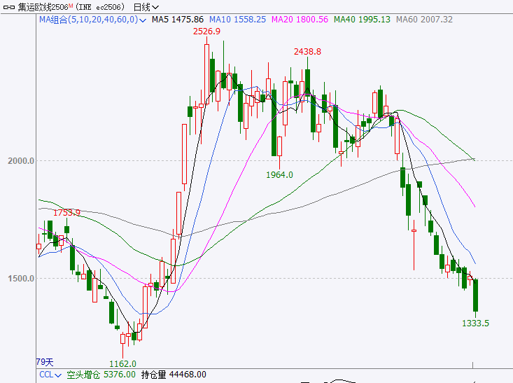 宏观情绪再度回落,叠加欧线即期运价持续疲弱,目前集运期市空头情绪高涨,主力EC2506合约增仓下跌,收于1358.4点,跌幅达9.4%。