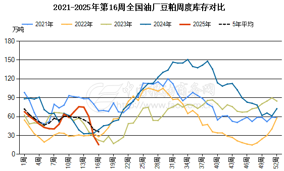 (2)油厂开机率连续多周偏低是导致豆粕库存下降的核心原因。粮油商务网数据显示,截至4月22日当周,油厂开机率为40.7%,远低于去年同期的62%。
