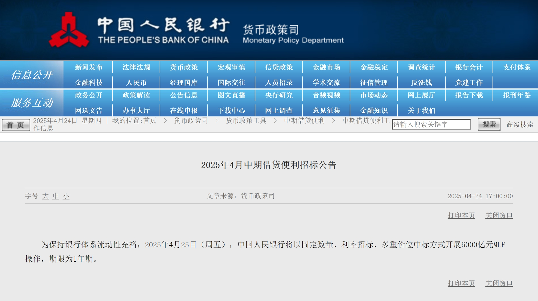 央广网北京4月24日消息(记者 冯方)4月24日,央行发布公告称,为保持银行体系流动性充裕,2025年4月25日(周五),央行将以固定数量、利率招标、多重价位中标方式开展6000亿元MLF操作,期限为1年期。