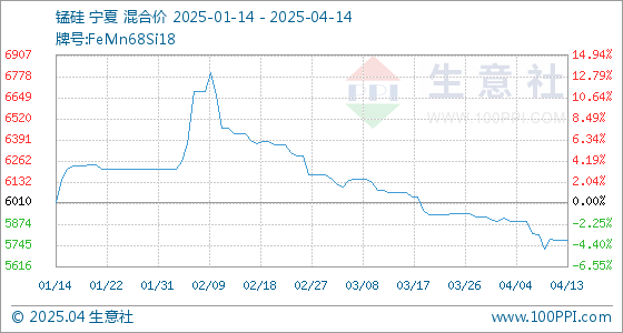 4月14日,生意社锰硅基准价为5776.00元/吨,与本月初(5900.00元/吨)相比,下降了-2.10%。