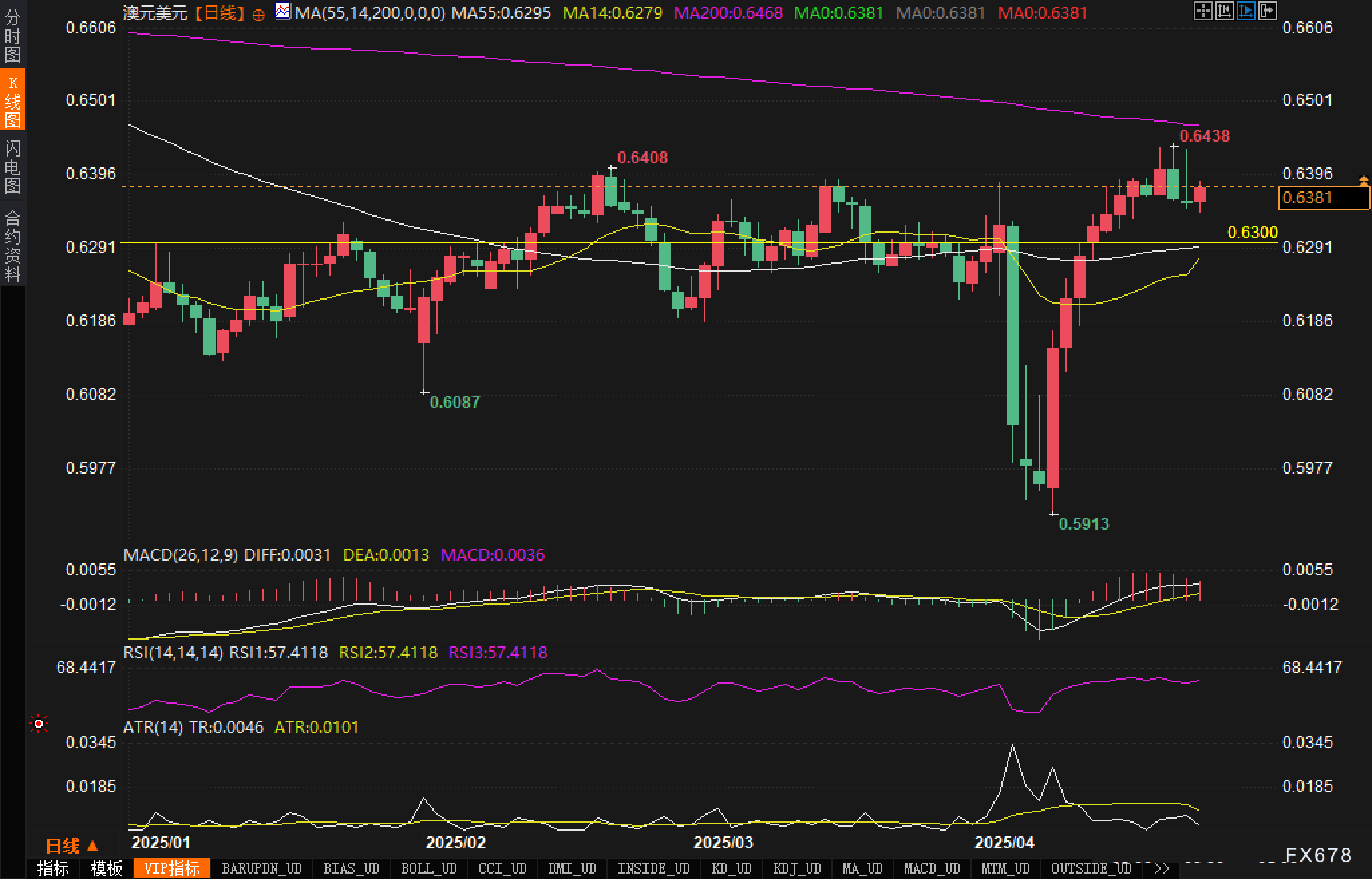从日线图分析,澳元/美元在经历4月的大幅下挫后(最低触及0.5913)展现出强劲的反弹势头;目前汇价正在测试主要水平阻力位0.64。MACD指标显示金叉形态,且红色柱状体积增大,显示上行动能增强。RSI指标读数为57.4118,处于中性偏强区域,表明趋势强劲但尚未超买。