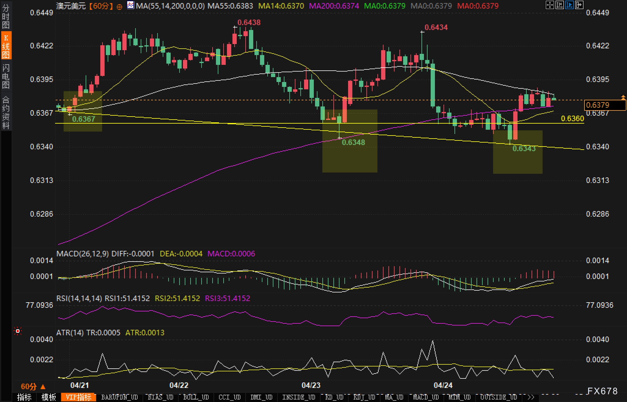 从60分钟图来看,澳元/美元目前位于关键阻力位0.64附近,MACD指标红色柱状显示多头动能在积累。RSI指标处于51.4152的中性区域,尚未进入超买区间,表明仍有上行空间。需要注意的是,在0.6348和0.6343附近形成了两个明显的支撑区域,这可能会在价格回调时提供支撑。