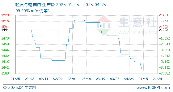 4月25日,生意社轻质纯碱基准价为1400.00元/吨,与本月初(1470.00元/吨)相比,下降了-4.76%。