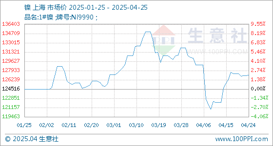 4月25日,生意社镍基准价为127050.00元/吨,与本月初(130633.33元/吨)相比,下降了-2.74%。
