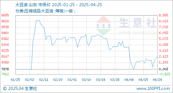 4月25日,生意社大豆油基准价为8146.00元/吨,与本月初(8342.00元/吨)相比,下降了-2.35%。