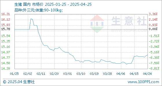 4月25日,生意社生猪基准价为14.88元/公斤,与本月初(14.62元/公斤)相比,上涨了1.78%。