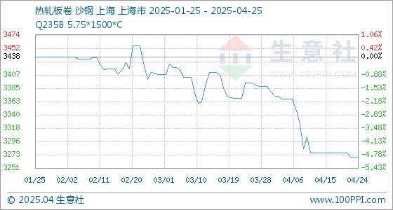 4月25日,生意社热轧板卷基准价为3270.00元/吨,与本月初(3380.00元/吨)相比,下降了-3.25%。