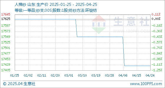 4月25日生意社人棉纱基准价为17425.00元/吨