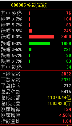 市场共2832只个股上涨,76只个股涨停,2371只个股下跌。