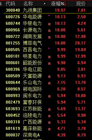 电力股集体爆发,湖南发展、明星电力、九洲集团、华银电力等近10股封板。