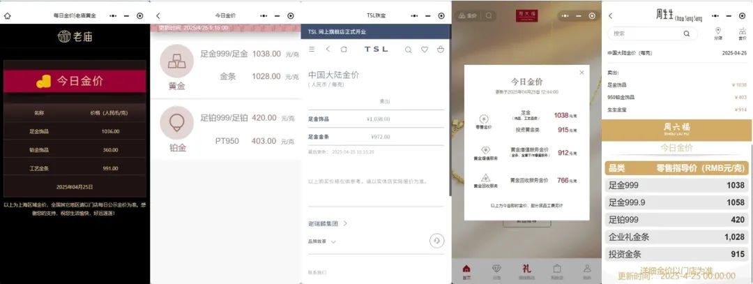 多家黄金珠宝品牌当日公布的境内足金首饰价格已普遍调整为1038元/克。具体而言,4月23日,周大福足金(首饰、摆件类)、六福珠宝足金999/足金、潮宏基足金(首饰摆件)、谢瑞麟足金饰品、周六福足金999、周生生足金首饰境内价格为1038元/克;老庙黄金上海区域足金饰品价格为1036元/克。