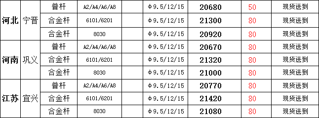 4月25日宁晋市场普铝杆现货报盘价20680元/吨,较上一交易日报价涨50元/吨;巩义市场普铝杆现货报盘价20670元/吨,较上一交易日报价涨80元/吨;宜兴市场普铝杆报盘价20770元/吨,较上一交易日报价涨80元/吨。