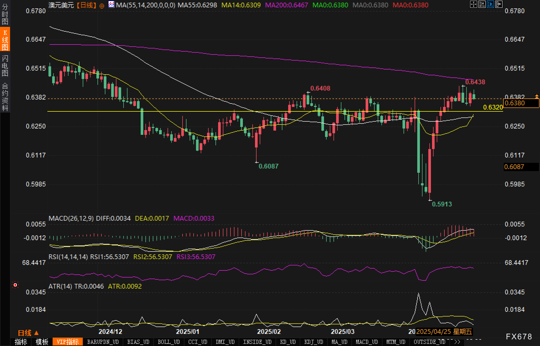 汇通财经APP讯——周五(4月25日)欧洲时段,澳元兑美元汇价下挫至0.6380附近,延续近期震荡整理走势。随着市场情绪出现微妙转变,汇价正处于技术与基本面双重考验之际,多空博弈愈发激烈。