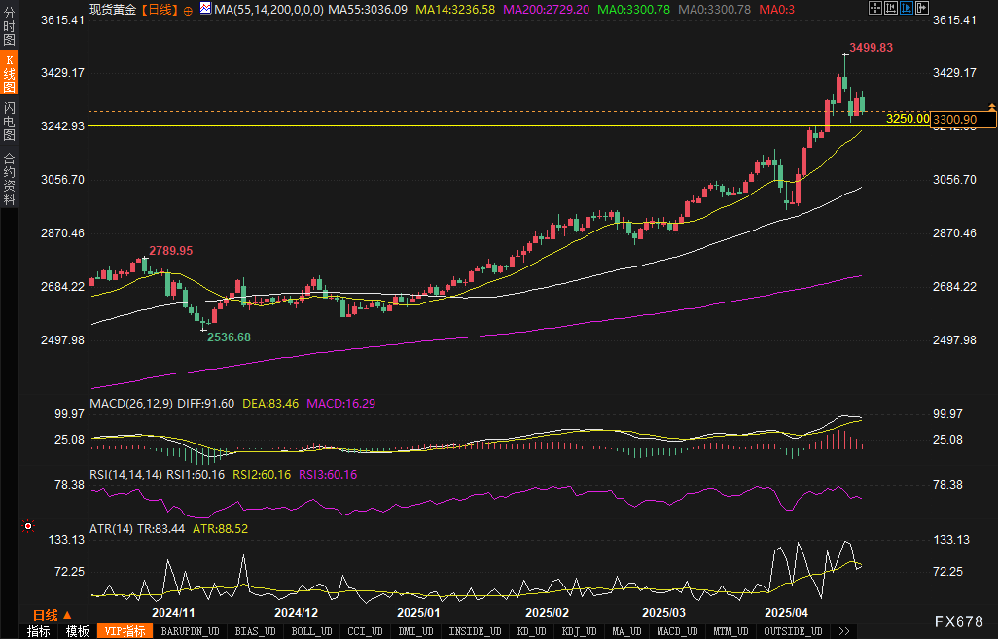 日线图上的技术指标仍保持在正区间内,表明中期上升趋势尚未改变。从图表中可明显观察到,金价自低点2536.68美元开始形成的上升通道依然完好,当前价格位于通道中上部运行。55日均线(MA55:3036.09美元)和14日均线(MA14:3236.58美元)继续呈现多头排列,提供良好技术支撑。