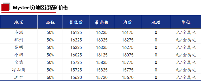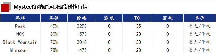 今日国内铅精矿加工费各地区均未调整,和上一交易日持平。进口TC主流报价-40至-20美元/干吨,进口铅精矿价格和上一交易日持平。