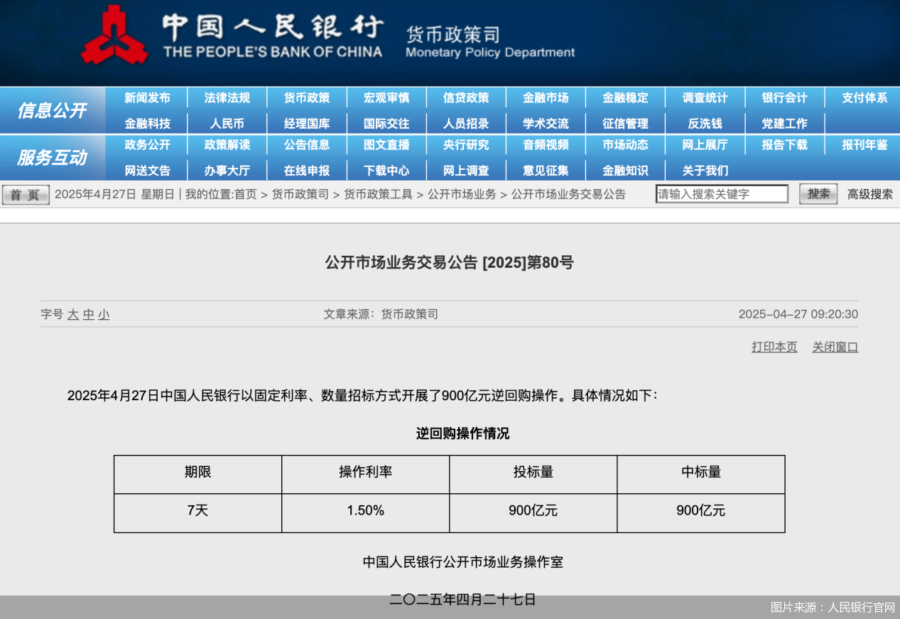北京商报讯(记者 廖蒙)临近“五一”小长假,人民银行加码逆回购操作。4月27日,据人民银行官网公告,为保持银行体系流动性充裕,2025年4月27日中国人民银行以固定利率、数量招标方式开展了900亿元逆回购操作,期限7天,操作利率1.5%,与此前保持一致。数据显示,4月27日没有逆回购到期,当日实现净投放900亿元。
