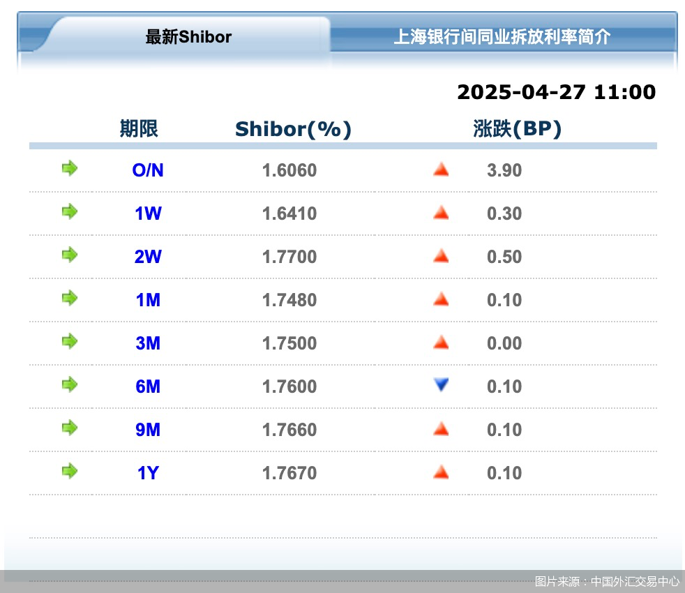 逆回购投放量的变化直接反映在市场资金面上。4月27日,上海银行间同业拆放利率多数上行。其中,隔夜Shibor利率报1.606%,上行3.9基点;7天Shibor上行0.3基点报1.641%。各个品种中,只有6个月期Shibor下行0.1基点报1.76%。