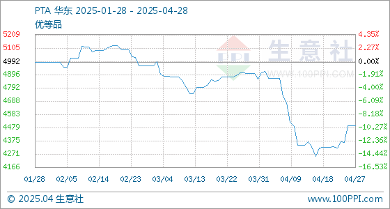 4月28日,生意社PTA基准价为4493.75元/吨,与本月初(4861.60元/吨)相比,下降了-7.57%。