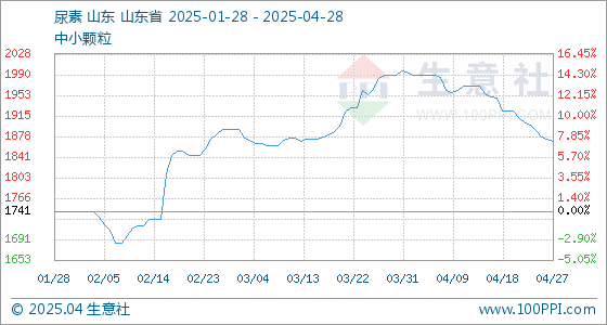 4月28日,生意社尿素基准价为1870.00元/吨,与本月初(1997.00元/吨)相比,下降了-6.36%。