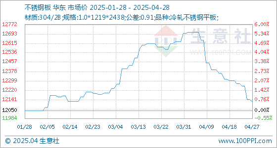 4月28日生意社不锈钢板基准价为12121.43元/吨